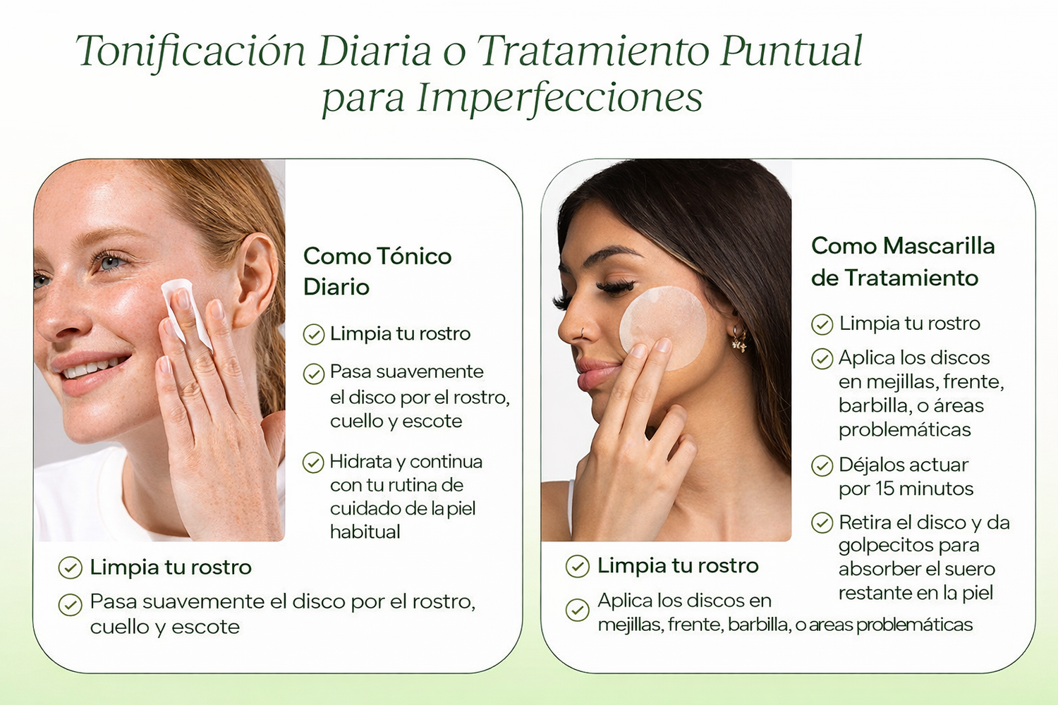• Como tónico diario: limpia tu rostro, pasa la almohadilla suavemente con movimientos circulares y deja actuar 40–60 segundos. Continúa con tu crema hidratante.